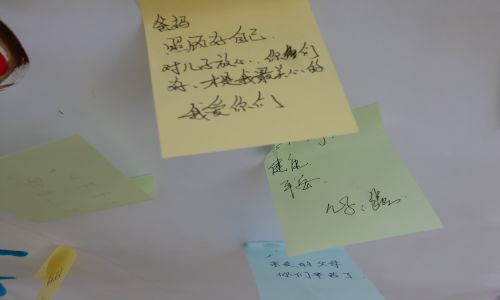 布置好场地后随即就有路过的同学积极参与进来,在便笺上写下对远方父母的祝福。随着广场人流的增加,越来越多的同学为这一新颖而温馨的活动所吸引。“爸爸,妈妈,您们辛苦了!”“我,爱,您!”……一张又一张深情诚挚的便笺跃然于展板。
