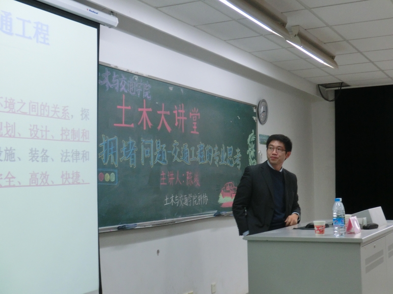 2014年11月8日下午,土木大讲堂第二十三讲在河海大学江宁校区致用楼418教室举办。本次讲座,特别邀请了东南大学交通学院院长助理兼交通系主任陈峻教授为我院2013级和2014级交通专业的本科生做报告,陈教授报告主题为《拥堵问题—交通工程的专业思考》。