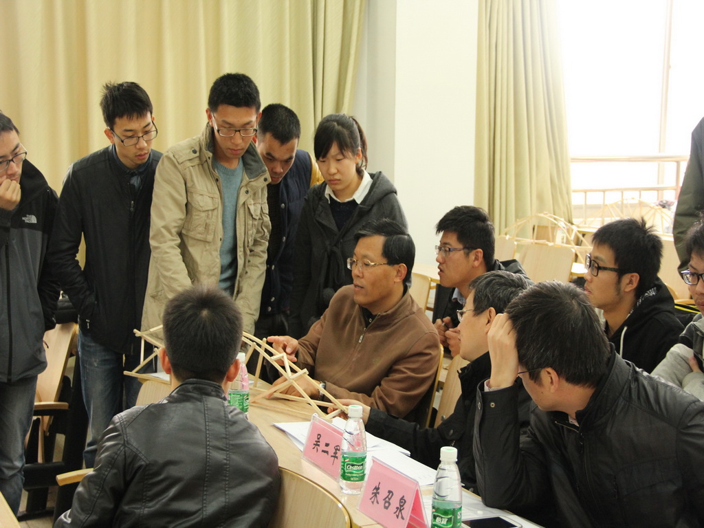 比赛赛题是“空间无推力拱结构”模型加载,成绩按照模型“载重比”确定。最终罗力中等同学制作的模型获得第一名成绩,并被评委老师推荐参加下周在南通大学举办的江苏省大学生土木工程结构创新竞赛。朱召泉老师还对本次赛题做了详细分析。