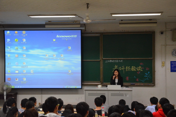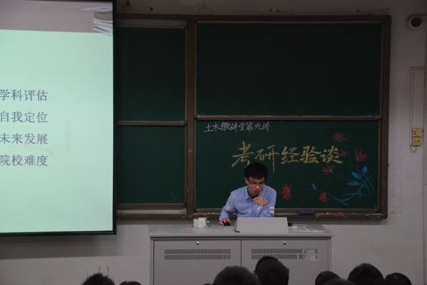 2015年5月11日晚,土木与交通学院“土木微讲堂”第十讲之考研经验谈在北教203正式开讲。本次土木微讲堂的主讲人为2011级土木工程专业张志恒,柯志强、杨睿和张琪,王璐老师和2012级部分本科生参加了本次讲座。
