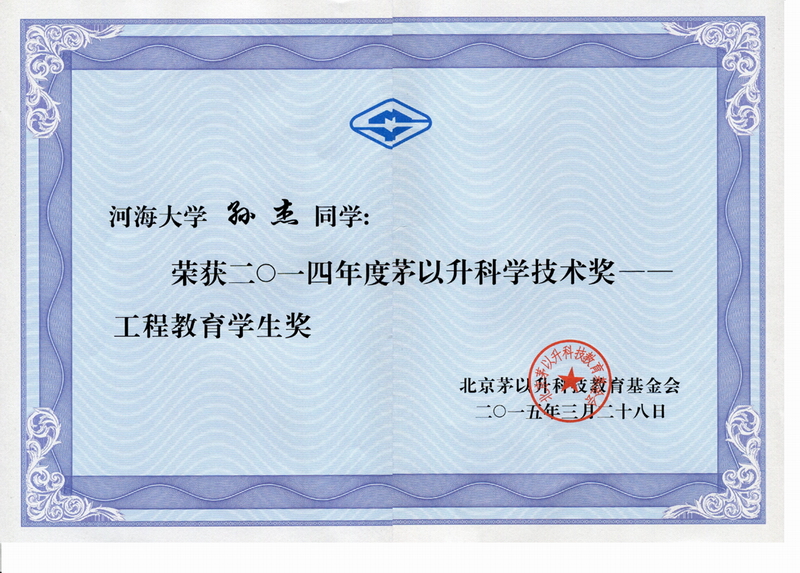 茅以升先生曾任河海工科大学校长。茅以升科技教育基金是为纪念我国桥梁工程奠基人、杰出的科学家、教育家和社会活动家茅以升先生,于1991年设立的科技奖励项目。基金设立20多年来,奖励了一批取得突出成绩的科技工作者、教育工作者和优秀学生,并开展了一系列科普活动,在社会上产生了重大影响。