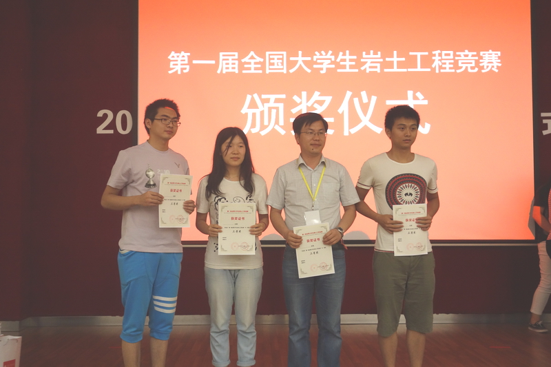 本届比赛的参赛队都是由来自全国土木工程专业评估中获得优秀等级的相关高校土木工程专业的本科生或研究生组成,其中包括清华大学、同济大学、哈尔滨工业大学、大连理工大学、河海大学、上海交通大学、重庆大学、华中科技大学等20多所高校代表队。我校参赛队通过计算书网络评审以及现场模型制作、加载等环节的层层考核,最终荣获三等奖,并在第十二届全国土力学及岩土工程学术大会上接受颁奖。