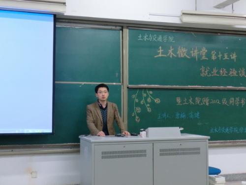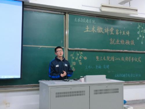 2015年11月10日19:00,土木与交通学院“土木微讲堂”第十五讲之“就业经验谈”暨学院赠2012级同学专业书籍仪式在本部闻天馆303成功举办。本次微讲堂邀请了已参加工作的2010级土木工程专业本科毕业生高健和唐楠学长作为主讲人,为学院2013级和2014级的同学们分享了自己的就业经验。