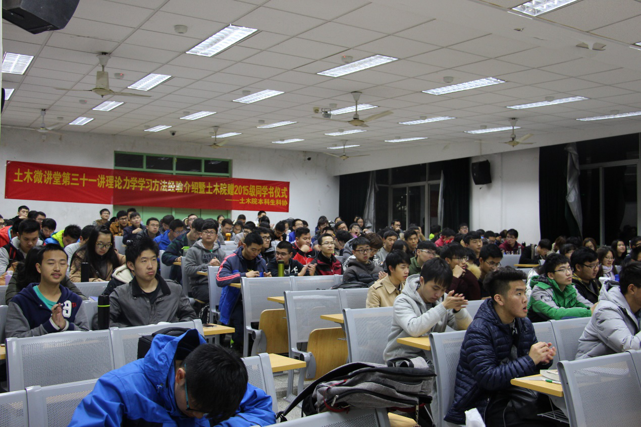 2016年11月22日晚18:30,由土木与交通学院本科生科协承办的土木微讲堂第三十一讲——“理论力学学习方法经验介绍暨2015级赠书仪式”在江宁校区致用楼117举办。本次微讲堂的主讲人是土木与交通学院2014级土木工程梁栋同学和秦亚俊同学。梁栋同学曾任土木院14级年级大班长,现任14级结构二班班长,获得国家奖学金,参加2015-2016年全国大学生先进成图与创新建模竞赛获得建筑类建模一等奖、个人全能二等奖、团体一等奖、创新竞赛一等奖;秦亚俊同学任土木院2014级年级学委,曾获国家奖学金,数学竞赛全国预赛二等奖、江苏省二等奖,数学建模竞赛省三等奖。