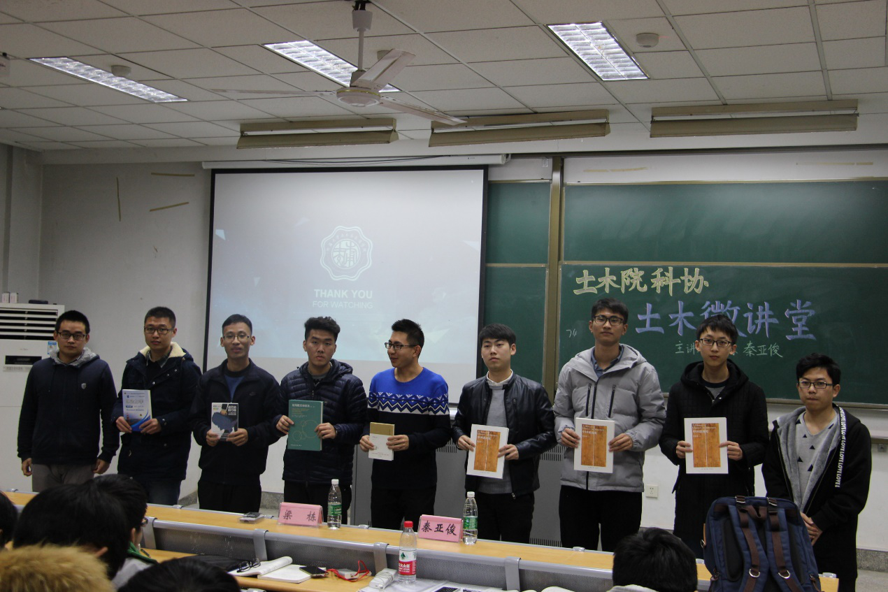 讲座结束后,举办赠书仪式。赠书活动是土木与交通学院的传统活动,每学期学院都会向各年级同学赠送与专业知识相关的书籍,旨在帮助同学们开扩眼界,提升专业素养。本次赠书书目有《中国建筑史》、《理论力学》、《结构概念与体系》等。两位主讲人将书籍赠送给了各班的同学代表。