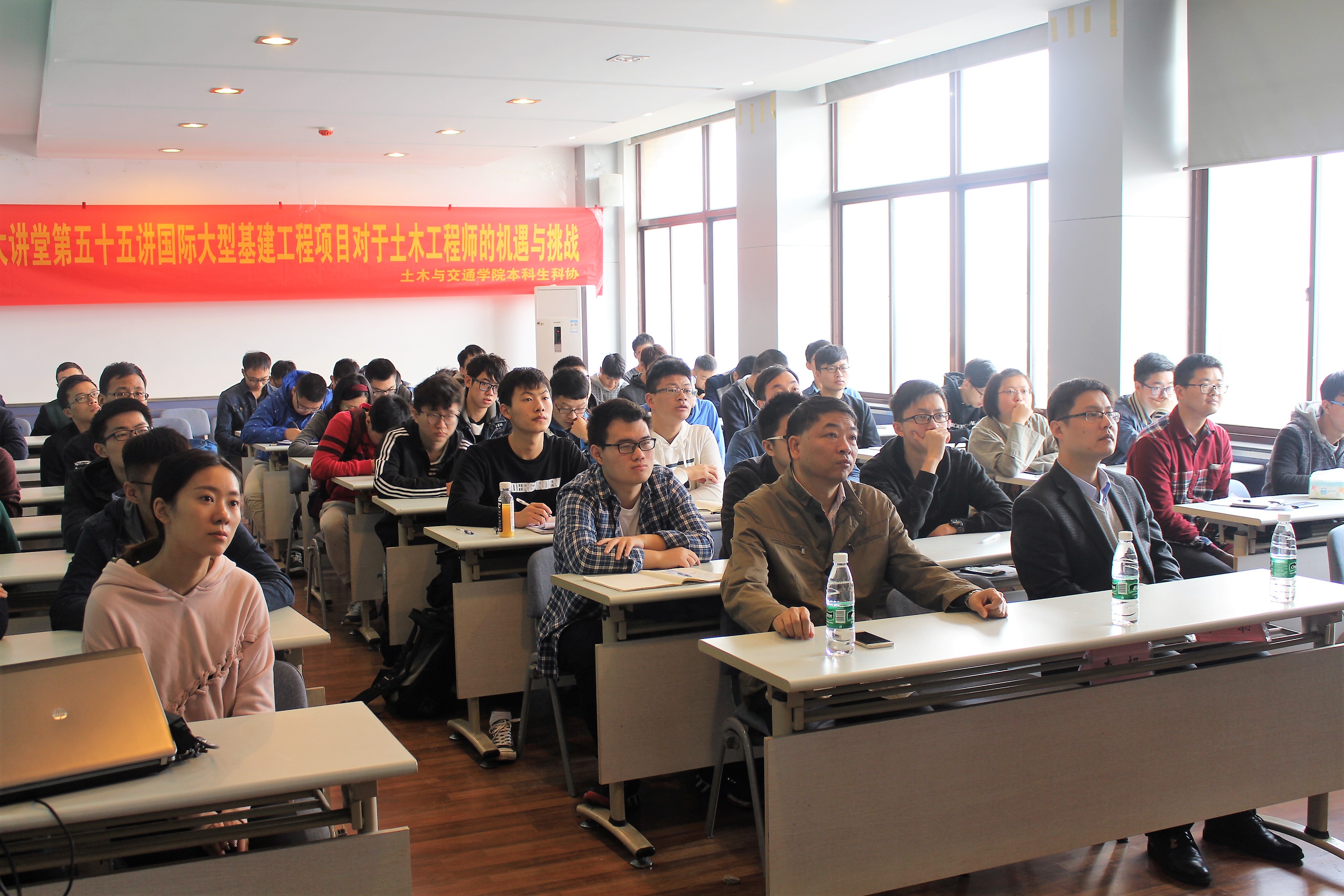 首先,李超会长结合多年参与国际大型基建工程的工作经历,从三个方面——技术的进步、实际工程中涉及到的环境问题、设计与施工间的联系与差异与在场的同学们分享了自己的见解,极大地开拓了同学们的眼界。同时,李会长还着重强调了以后面临具体工程时,不仅要拥有扎实的专业知识,还需要具备法律、合同、商业意识并掌握一些投标的技巧。接着,李会长运用具体的案例向同学们介绍了自己亲身参与过的多个大型国际基建项目中的特色与难点。在最后交流答疑环节中,同学们踊跃提问,李会长细心解答了同学们对未来参与实际工程项目的诸多困惑,并对在场的各位同学提出殷切的期望,希望大家不畏难、有担当、会思考、能吃苦,使同学们受益匪浅。