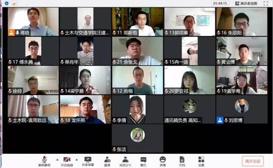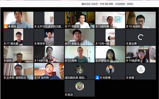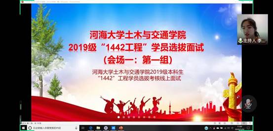 2020年5月20日土木与交通学院2019级“1442工程”学员选拔面试在线上顺利举行。本次面试由18级本科生蒋晗、李雨欣主持,并邀请到了学院党委书记汪建新、党委副书记潘静、院团委书记王璐,16级辅导员陈明明、李迎珠老师,17级辅导员张洁老师,18级辅导员李倩老师,交通1班班导师单肖年老师,土木4班班导师闵凡路老师,土木5班班导师袁周致远老师,高年级优秀学生干部汪淼、沈楠、赵星宇、黄业博、徐帅同学作为本次选拔面试的评委。