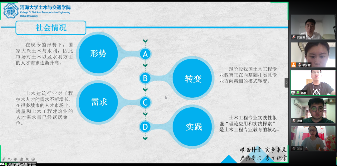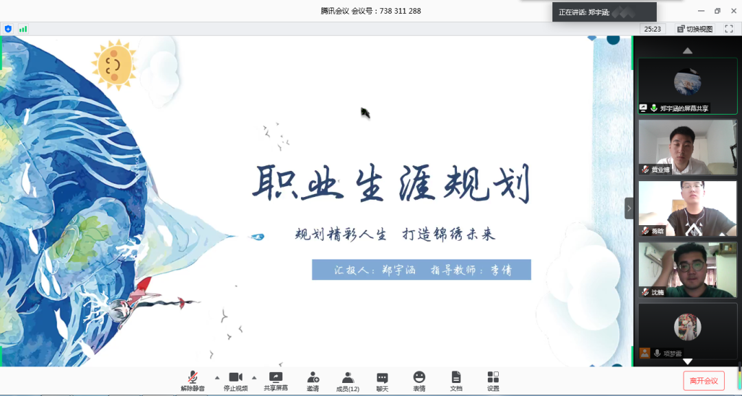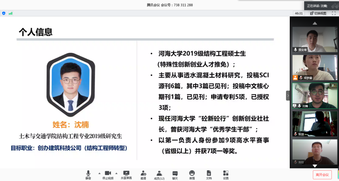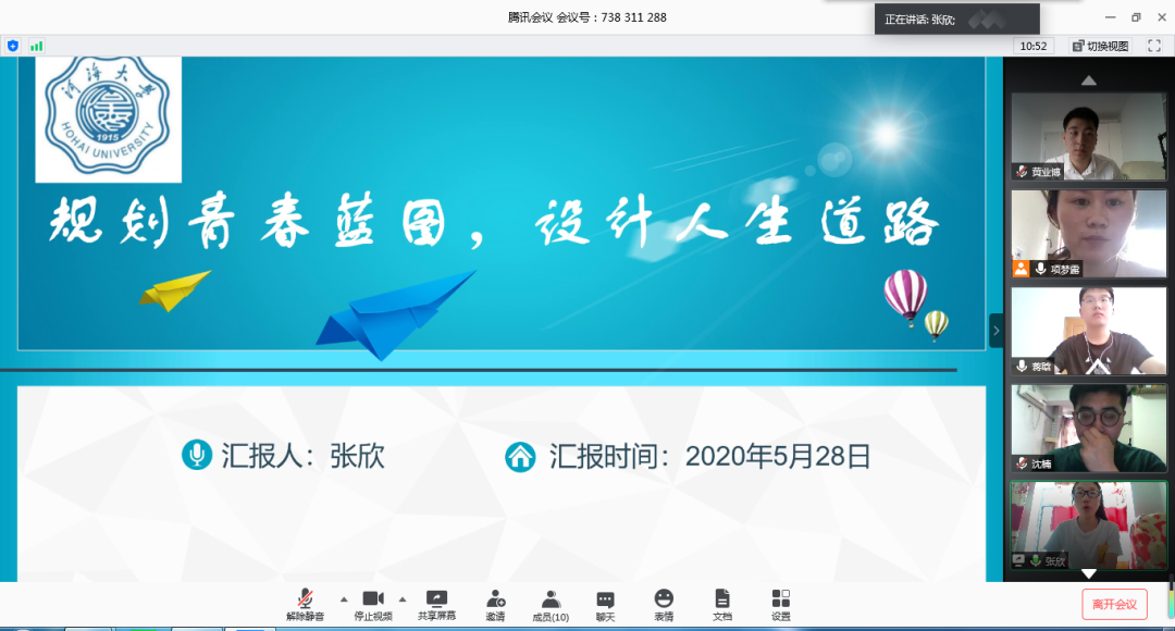 2020年5月28日9:00,学院举办了第十五届大学生职业规划大赛院内初赛选拔,大学生职业规划大赛优秀指导老师李娜、党委副书记潘静、辅导员王璐、揭春兰、项梦露、李倩老师担任评委。本次初赛选拔采用线上答辩形式,共有6名同学进行了初赛答辩。