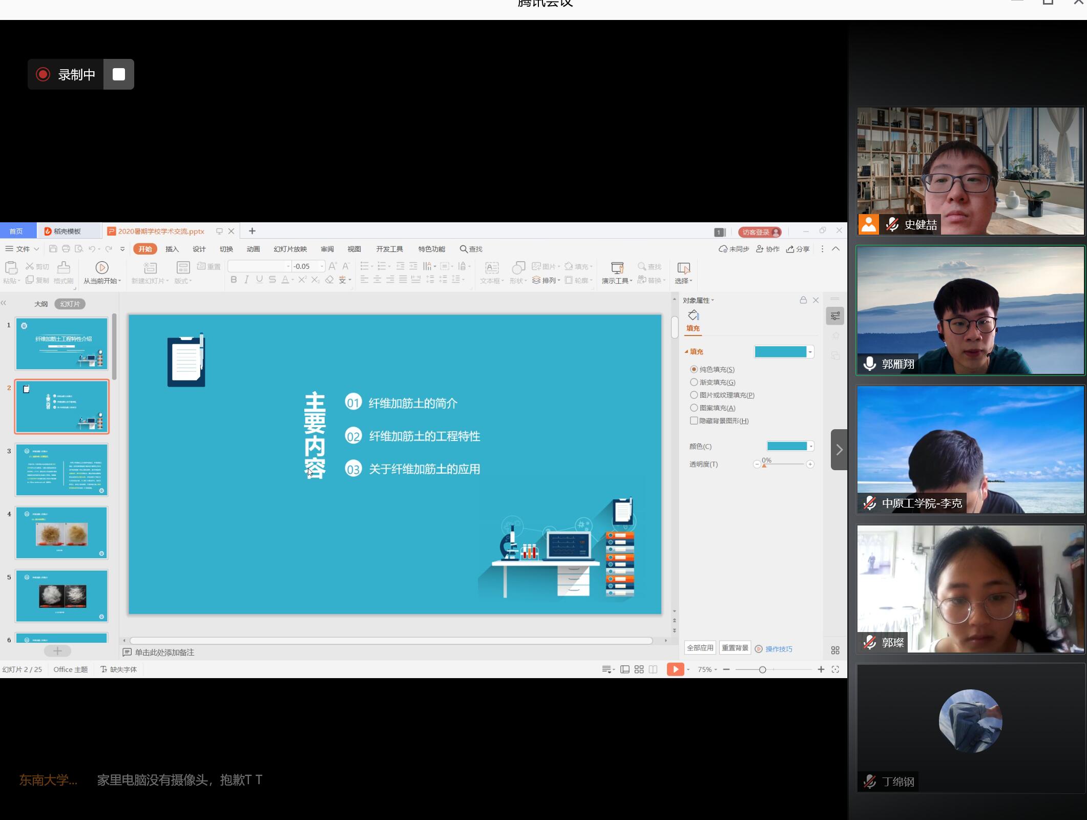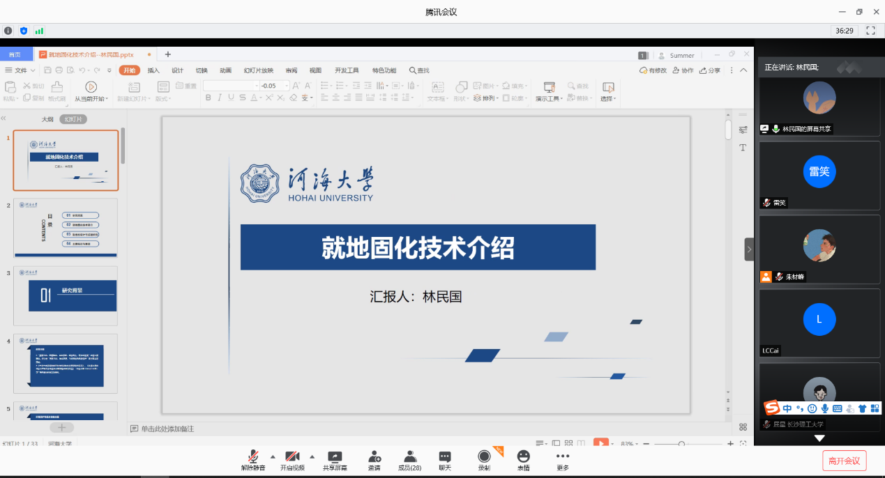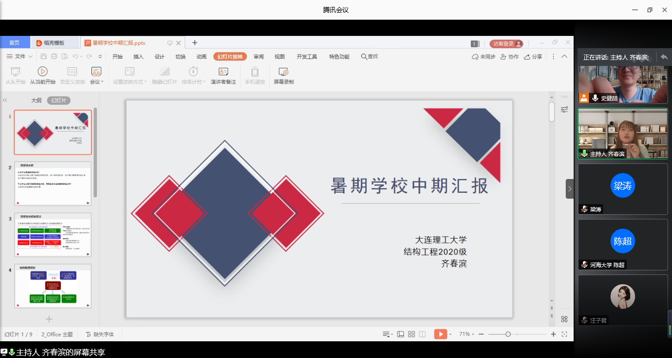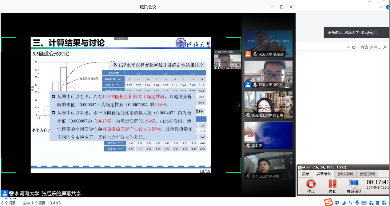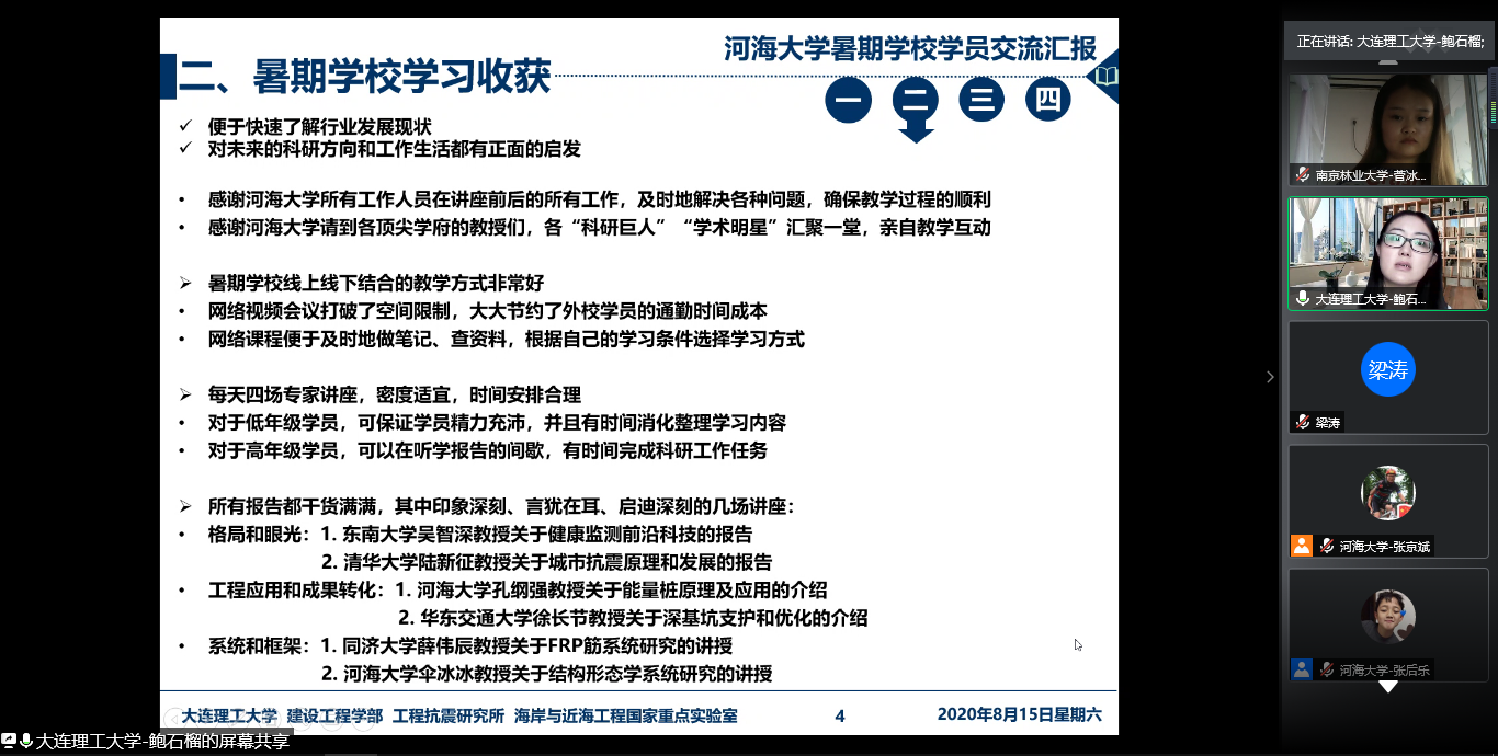 815日是2020年江苏省研究生“岩土工程与结构安全”暑期学校的第六天。今天是本次暑期学校专项活动“学员交流日”,经过连续四天的学术大餐,学员们在学海畅游、丰富自身的同时,也结识了各路志同道合的好友,本着“以文载道,以学会友”的精神,今日将舞台交给学员,在四个会场、共16场会议中,学员们纷纷上台进行了PPT汇报,踊跃发言,或是介绍自己的研究课题,或是分享自己的学习心得,或是介绍自己的学校专业等,大家进行了丰富多样的讨论,学员之间有了更进一步的了解。