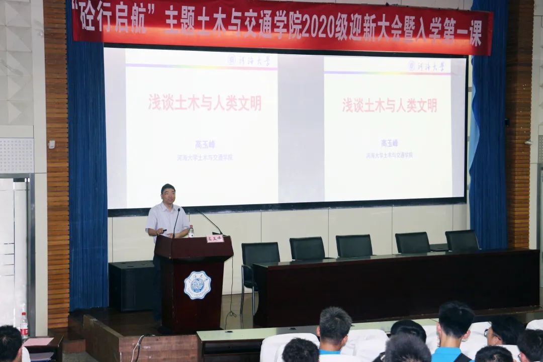 随后,大会进入第二部分,院长高玉峰教授以“浅谈土木与人类文明”为题向新生们讲授开学第一课。围绕“从一个土木人的视角看中华文明”这一话题,高院长列举了一系列由土木人创造的灿烂古代文明与现代文明,生动阐明了土木的内涵,并结合促成良渚申遗的亲身经历讲述了传承人类文明与土木工程、交通工程的密切联系,勉励同学们要学以致用,不断提高专业素养。