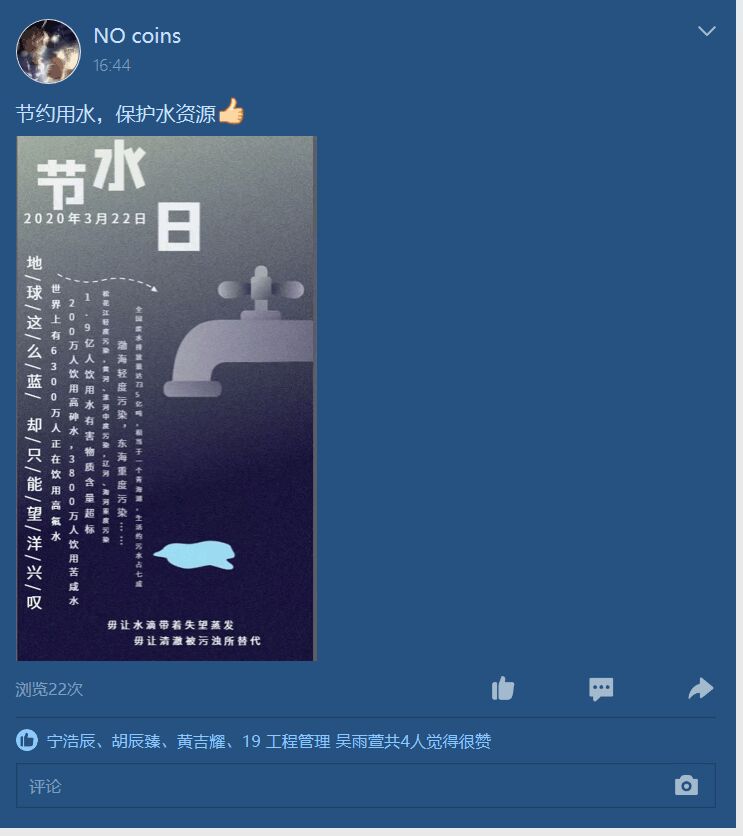 3月24日至29日,同学们创作并提交了自己的作品,之后作为节水宣传志愿者,在线上将自己的作品发布至QQ空间/微信朋友圈,配上节约用水相关的文字,起到了节水公益宣传的效果。