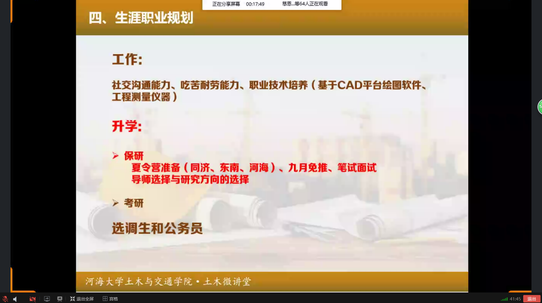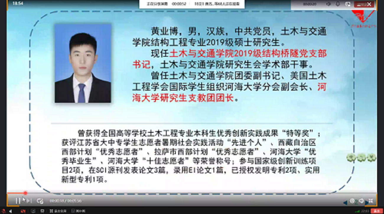 2020年6月13日18:30,由土木与交通学院主办,学院本科生科协承办的土木与交通微讲堂第七十八讲之“魅力毕业生”大学生生涯规划分享成功举办。由于疫情原因,本次微讲堂仍采用云直播的方式进行。本次微讲堂有幸邀请到土木与交通学院结构工程专业2019级硕士研究生沈楠、黄业博,土木大禹班2016级本科生陈世壮作为主讲人。土木与交通学院2018和2019级部分学生聆听了本次讲座。