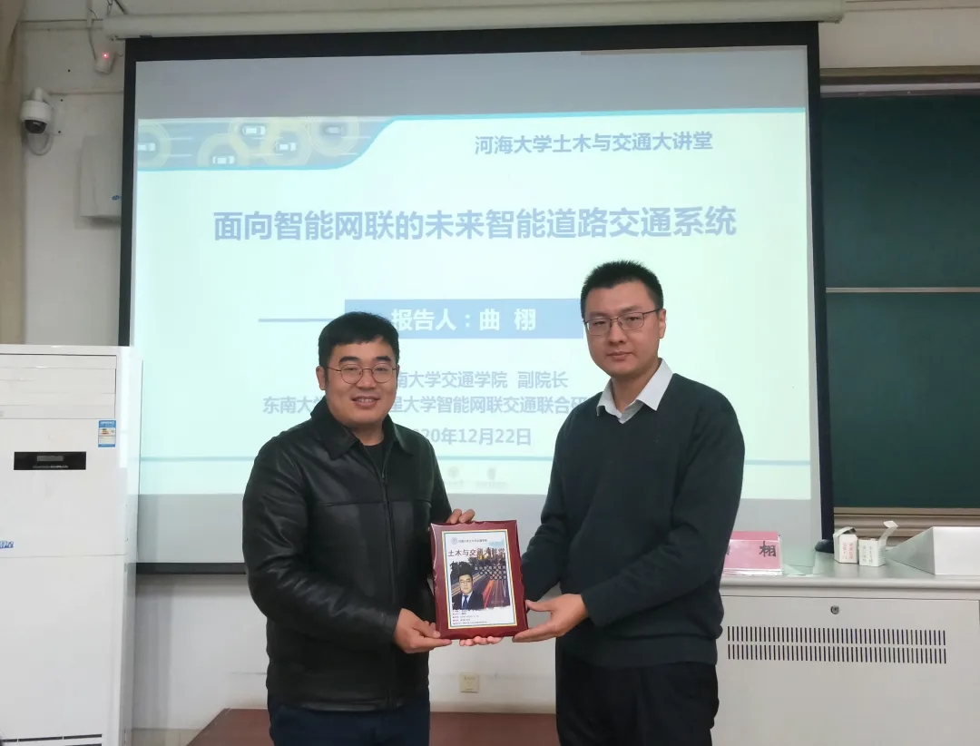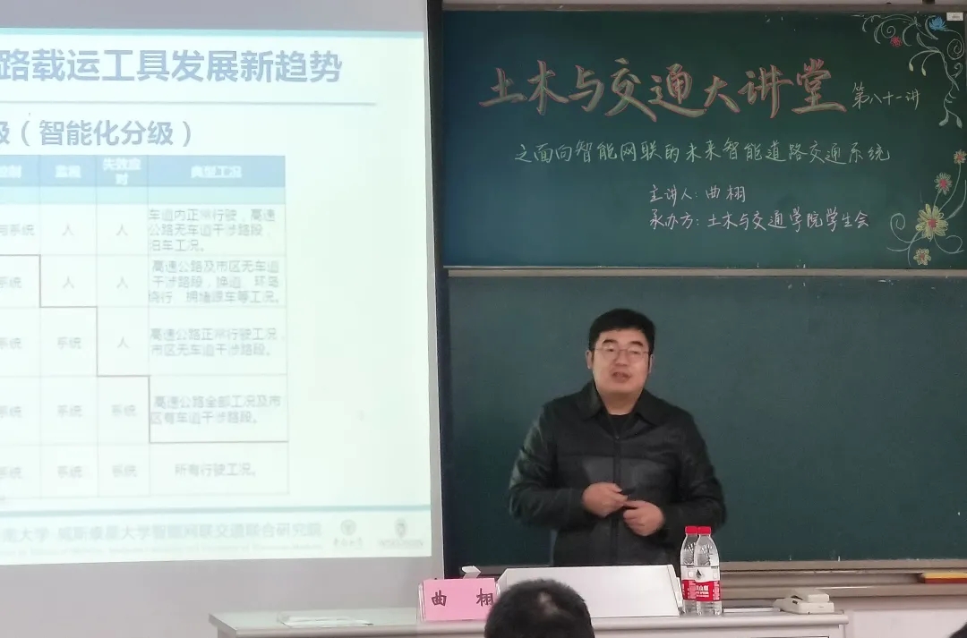 2020年12月22日16:00,由土木与交通学院主办,学院本科生学生会承办的土木与交通大讲堂第八十一讲之“面向智能网联的未来智能道路交通系统”在河海大学江宁校区博学楼B208成功举办。本次大讲堂有幸邀请到东南大学交通学院副院长、东南大学-威斯康星大学智能网联交通联合研究院副院长曲栩教授作为主讲人。土木与交通学院2019级和2020级部分学生聆听了本次讲座。