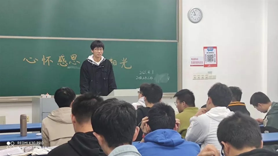土木三班邀请到优秀学长李文博为同学们分享他大学第一年的心路历程。学长结合自身经历向同学们提出了很多接地气的建议。学生代表向李文博学长提出目前自己迷茫的问题,学长为大家耐心地答疑解惑。班级还组织大家观看电影《叫我第一名》,电影主人公乐观积极的生活态度和坚持不懈的拼搏精神给同学们留下了深刻印象,激励大家在生活中勇往直前。