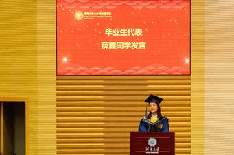 研究生毕业生代表薛鑫同学发言,总结了三年的研究生生活让自己学会了担当、体味了生命的精彩。她代表2022届毕业生作出承诺,一定会在未来的工作、学习中将新时代青年的理想内化于心、外化于行,用青春热血去书写绚丽华彩的中国梦。