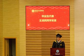 本科毕业生代表王润民同学发言,首先表达了对学院老师最真挚的感谢,王润民同学从学会树立目标出发,讲述了自己在各种挑战中的成长与收获,并表示在今后的前进道路上将始终谨记母校的叮咛,前路漫漫,志在四方,努力实现人生梦想。
