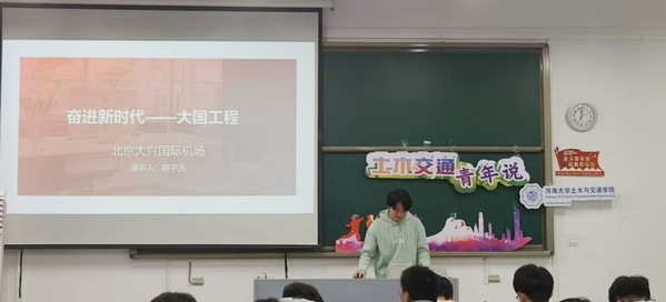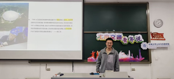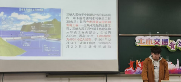 为向同学们介绍近十年来我国建造的大国工程,讲述其中所蕴含的中国力量与中国精神,土木与交通学院团委青年发展部于2022年11月19日18:30在河海大学江宁校区励学楼103举办以“奋进新时代——大国工程”为主题的土木交通青年说。本次活动邀请到土木与交通学院本科生王江昱、刘正阳、叶金喆、赵炜、姚宇浩作为主讲人,21级及22级部分同学参与了本次活动。