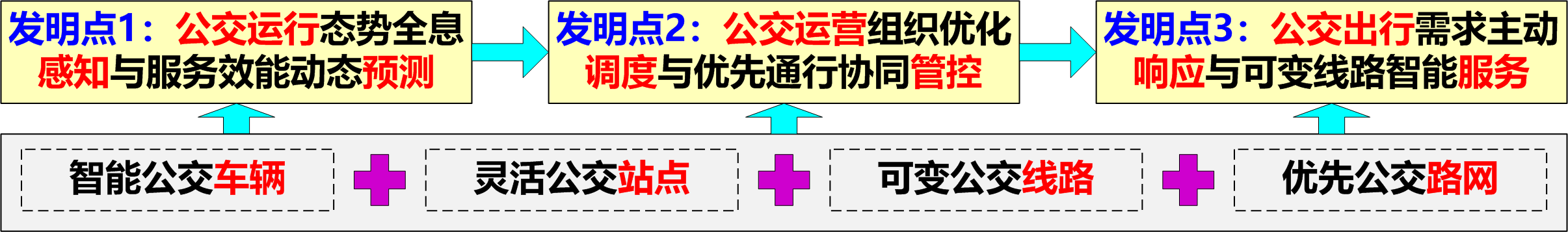 研究团队借助车路交通信息互联技术,开展“智能车辆实时调度”“灵活站点集约布设”、“可变线路动态优化”、“优先路网协同管控”的公交系统一体化科研与实践,攻克了公交运行特征全息感知与态势精准预测、公交运营线网协同管控与设施集约布设、公交出行服务需求响应与效能可靠提升等技术难题,研发了面向服务的车路信息交互公交运行态势感知与运营组织管控关键技术(如图1所示)。