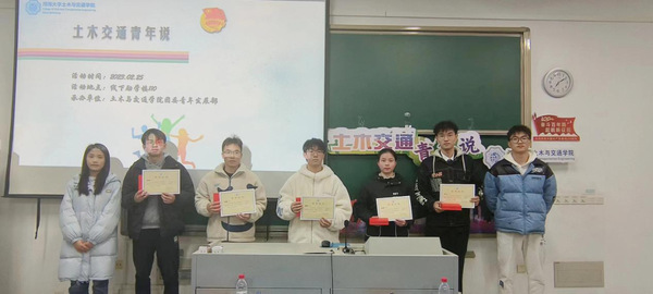 在演讲结束后,土木与交通学院团委团建指导员陈鸿羽以及青年发展部副部长覃小容为五位主讲人颁发荣誉证书并赠送精美礼品。