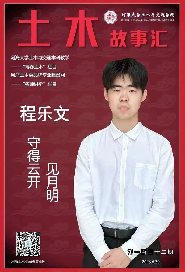 程乐文,男,汉族,中共党员,太阳集团tyc1512019级土木工程专业本科生。曾任河海大学团建指导员、太阳集团tyc151团委学生副书记、江宁负责人、2019级年级学习委员、2019级土木三班学习委员。现推免至河海大学岩土工程专业攻读硕士学位。
