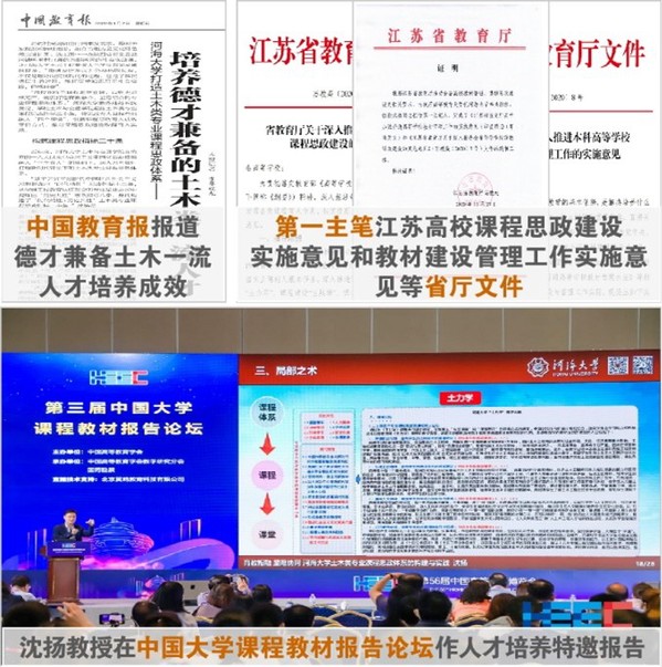 学科人才培养整体成效获鉴定组龚晓南、杨永斌、朱合华、王明洋、钮新强、唐洪武六位院士的高度评价。河海大学土木专业排名(武书连版)从2017全国第11跃升至2021、2022年的全国第4(一流学科建设高校首位)和江苏第1。受国家教育体制改革领导小组办公室原副主任袁振国邀请,学科建设成果举措与成效作为典型案例写入其主持的国社科重大课题《立德树人落实机制研究》。