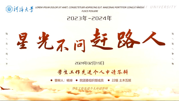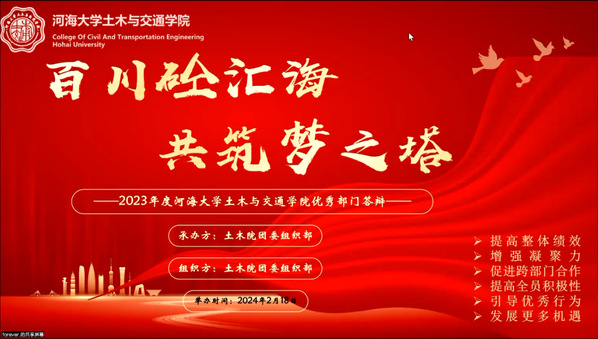 由土木与交通学院主办,院团委组织部承办的土木与交通学院2023年度优秀部门与先进个人评选活动以线上会议的形式成功举办。本次活动有幸邀请到院团委副书记李倩老师,研究生辅导员邵文慧老师,2021级本科生辅导员韩新禹老师,2022级本科生辅导员高建相老师,2023级本科生辅导员胡锦蓉老师担任评委,由院团委组织部赵新同学和沈元彬同学分别担任两场活动主持人。