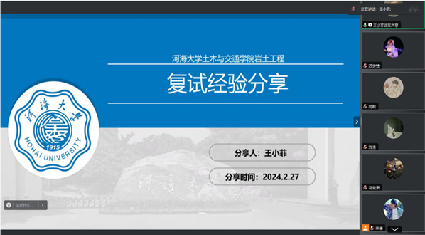 接着,王小菲同学结合自身经历,为同学们详细解说了河海大学岩土工程的复试流程。复试包括土力学科目的笔试以及面试,面试包括英文能力测试、中英文自我介绍和专业课问答题。当老师提问到自己不熟悉的内容时,同学们也要保持冷静,微笑应对,给老师们留下大方得体的印象。她鼓励同学们无论初试分数高或低,都不要轻易松懈或过度焦虑,坚持把复试准备充分才是最重要的。