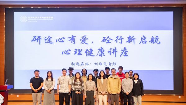 为了让同学们更高效而愉快地生活、妥善处理压力,4月18日下午,学院开展了“研途心有爱,砼行新起航”主题心理健康教育讲座。河海大学心理健康教育中心主任刘取芝老师为同学们做题为“研途有爱——研究生的向阳成长之路”的心理健康讲座,研究生辅导员邵文慧老师、邓瑞华老师参加了本次讲座。