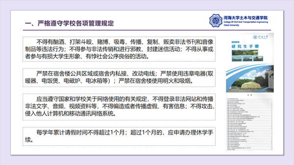 在自由交流环节,邓瑞华老师与同学们亲切交流,解答同学们提出的困惑与问题,并重点关心同学们在校期间与导师的沟通交流情况。随后,邓瑞华老师向同学们明确日常管理要求与注意事项:一是要认真阅读《研究生手册》,严格遵守学校各项管理规定;二是正常学习期间,因事因故外出必须及时、规范履行请假手续;三是要增强日常安全防范意识,切莫掉以轻心;四是要注重日常心理调节,利用人际环境构建自身心理支持系统,形成积极支持效应。