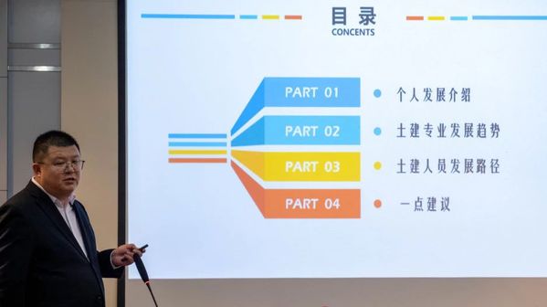 程兴学长从个人发展、土建专业发展趋势、土建人员发展路径、个人建议四个方面给同学们作细致而深刻的分享。指出数字化、平台化、产业化和国际化是土建专业未来发展的重要方向,为同学们提供了宏观的行业视角。强调专业融合、善于学习、良好沟通和做事靠谱是土建专业所需的关键员工特质。针对河海大学土木与交通的学科优势,给出具体就业建议,助力研究生做好职业规划。最后,学长提醒同学们“在人生的道路上选择大于努力”“思路决定出路,格局决定结局”。