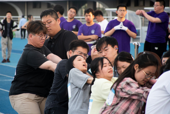 毛毛虫竞速团体赛是对体力与合作的一项双重考验,需要团队成员通过喊口号,步伐协调地搬运充气“毛毛虫”配合前行。一声哨响,“砼”学们应声而动,步调一致,整齐划一,勇往直前,争分夺秒。