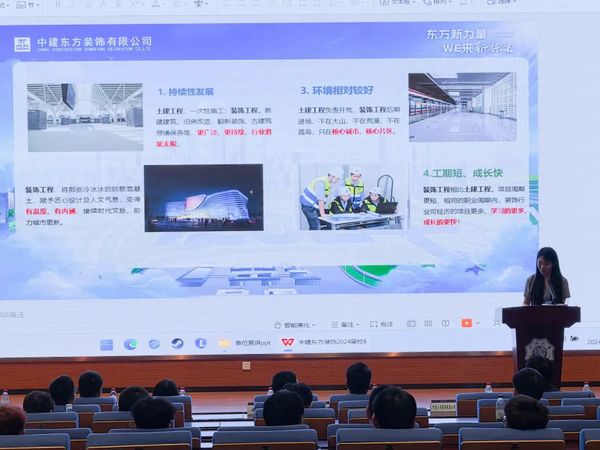 企业宣讲环节,上海建工一建集团、中建安装集团、中建东方装饰有限公司、中建一局集团一公司、中铁七局集团有限公司、中建八局集团轨道公司依次上台进行了宣讲,向本科毕业班学生们介绍了各自公司历史文化、待遇福利和岗位信息,并分享了他们对毕业生的期望和要求。
