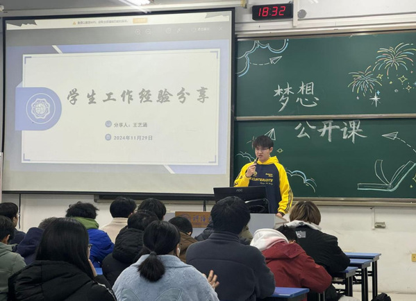 2024年11月29日,由土木与交通学院团委主办、心协承办的梦想公开课于励学楼103举办。本次梦想公开课邀请了2022级优秀学生王艺涵、吴玺含、吴乐蕊同学作为主讲人,分享他们在大学期间的心得感悟与对学弟学妹们的殷切建议。土木与交通学院2024级的同学们参与了此次活动.