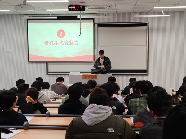 接下来,研究生帮扶代表2024级结构工程专业研究生王钧乐同学上台发言,他指出要在学习中互帮互助才能行稳致远。此外,他还鼓励同学们在帮扶联动中保持进取的态度,敢于发言,勤于提问,在相互学习中实现自我提升。