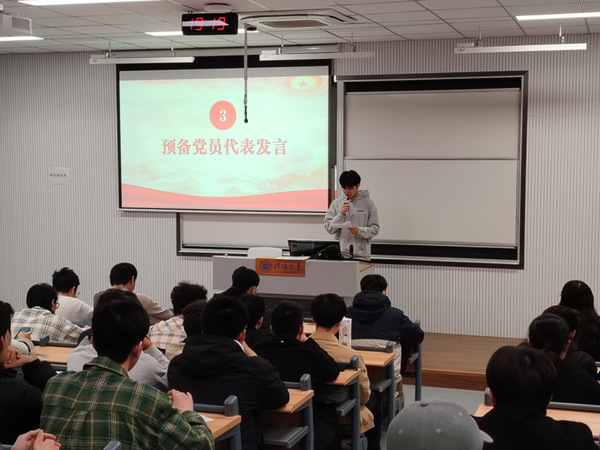 随后,预备党员代表李润棋同学上台发言。在台上,李同学分享了自己的学习方法和感悟,课上要珍惜时间,做好课堂记录,课下提高自主学习能力,认真复习,提高学习效率。同时,李同学呼吁同学们携手共进,共同打造优良的学习氛围,在相互激励中并肩前行,共同进步。